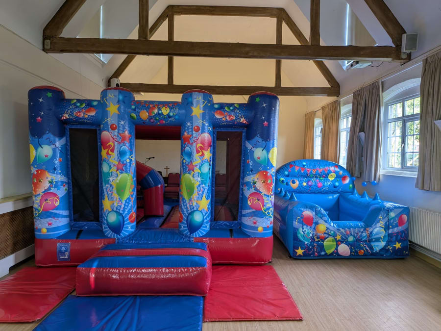 Red & Blue Party Themed Midi Castle & Inflatable Ball Pit is available for Hire in Walton on Thames and surrounding areas.